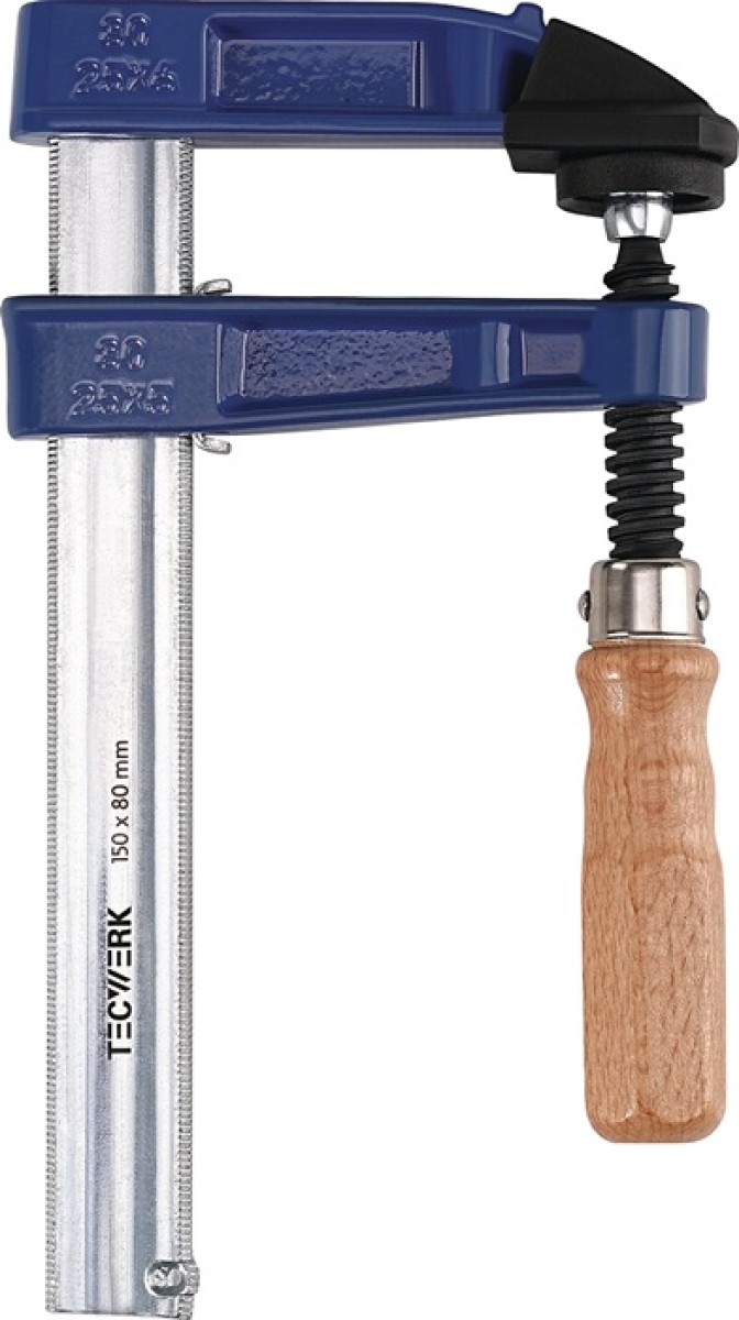 Veiligheidsklem · Met wegglijbescherming in het schuifdeel · Spanarmen van hoogwaardig getemperd gietijzer · Gegoten delen blauw gepoedercoat · Verzinkte holprofielrail · 3-voudig geribbeld aan 2 zijden · Beweegbare stalen drukplaat · Trapeziumvormige schroefdraadspil · Kunststof beschermkap en kunststof ring op het ergonomische essenhouten handvat